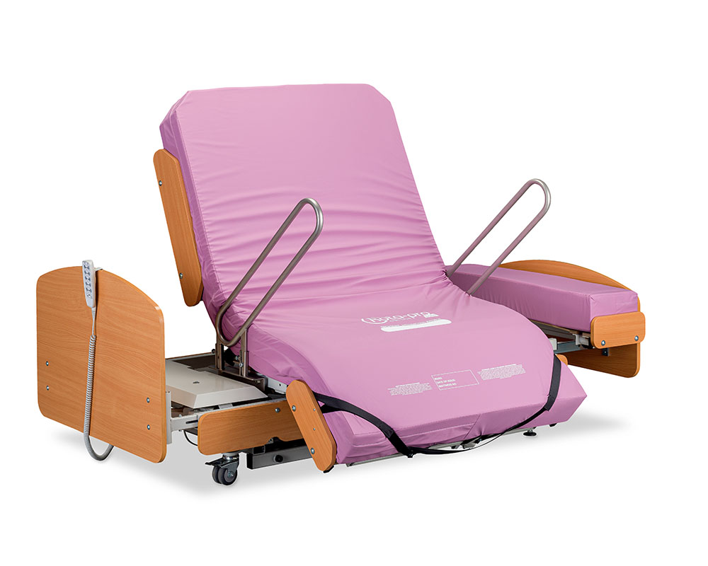 Based on an Innovative rotational chair design all of the Rota-Pro® family (Rota-Pro® Standard, Rota-Pro® Low, Rota-Pro® Bario & Rota-Pro® Bario Low) have a robust construction aimed to bring back mobility, dignity and independence to users of all shapes, heights and sizes. This bed can be offered to people who are weight bearing and able to walk but struggle transferring from sitting to standing. The attractive beech timber bed frame and specially designed pressure reducing mattress enables users to get into and out of bed unassisted.